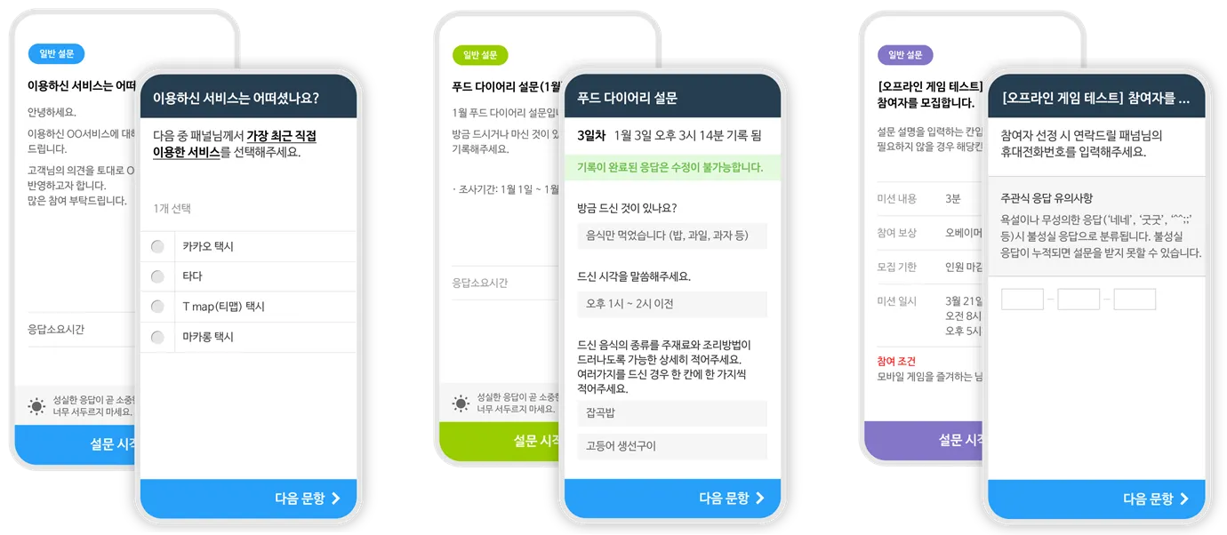 패널은 일반 설문, 미션형 설문, 리크루팅 설문과 같은 다양한 종류의 설문에 응답할 수 있습니다.