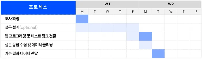 프로젝트의 통상적인 소요 일정이며, 조사 난이도 및 상황에 따라 더 빠르게 혹은 느리게 진행될 수 있습니다.